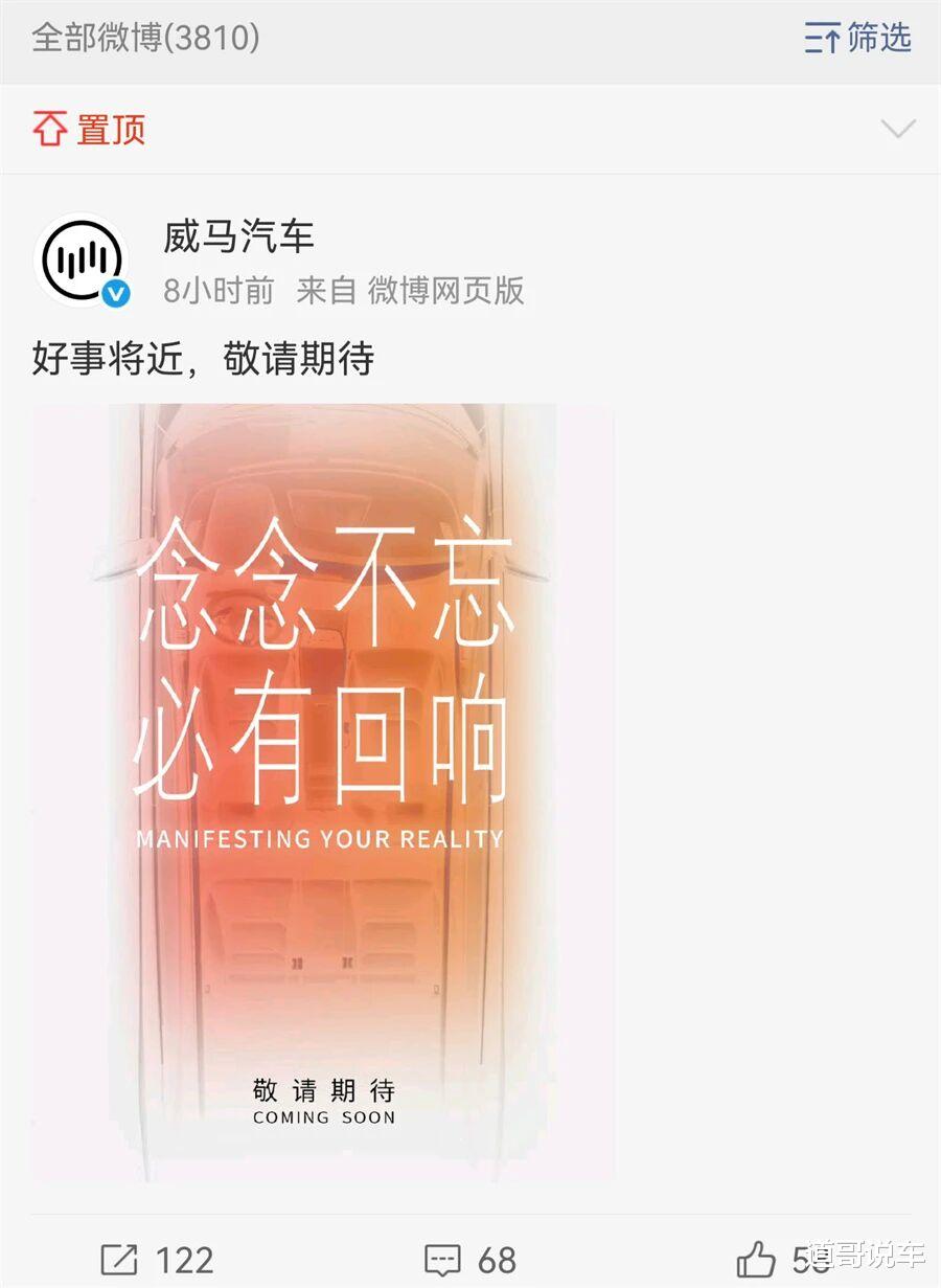 【文/财圈社&道哥说车 张浅】11月3日下午,手机屏幕上弹出威马汽车微博更新提醒时,不少关注新能源汽车的网友差点以为自己眼花了。这家沉寂如水的车企,突然带着“好事将近,敬请期待”八个字和“念念不忘,必有回响”的配图重回大众视野。就像一场早已散场的电影突然亮起续集的预告片,这条微博瞬间在车友群和行业论坛炸开了锅。要知道,威马可是最早那批造车新势力里第一个倒下的,如今却可能要成为第一个从破产废墟里爬出来的。