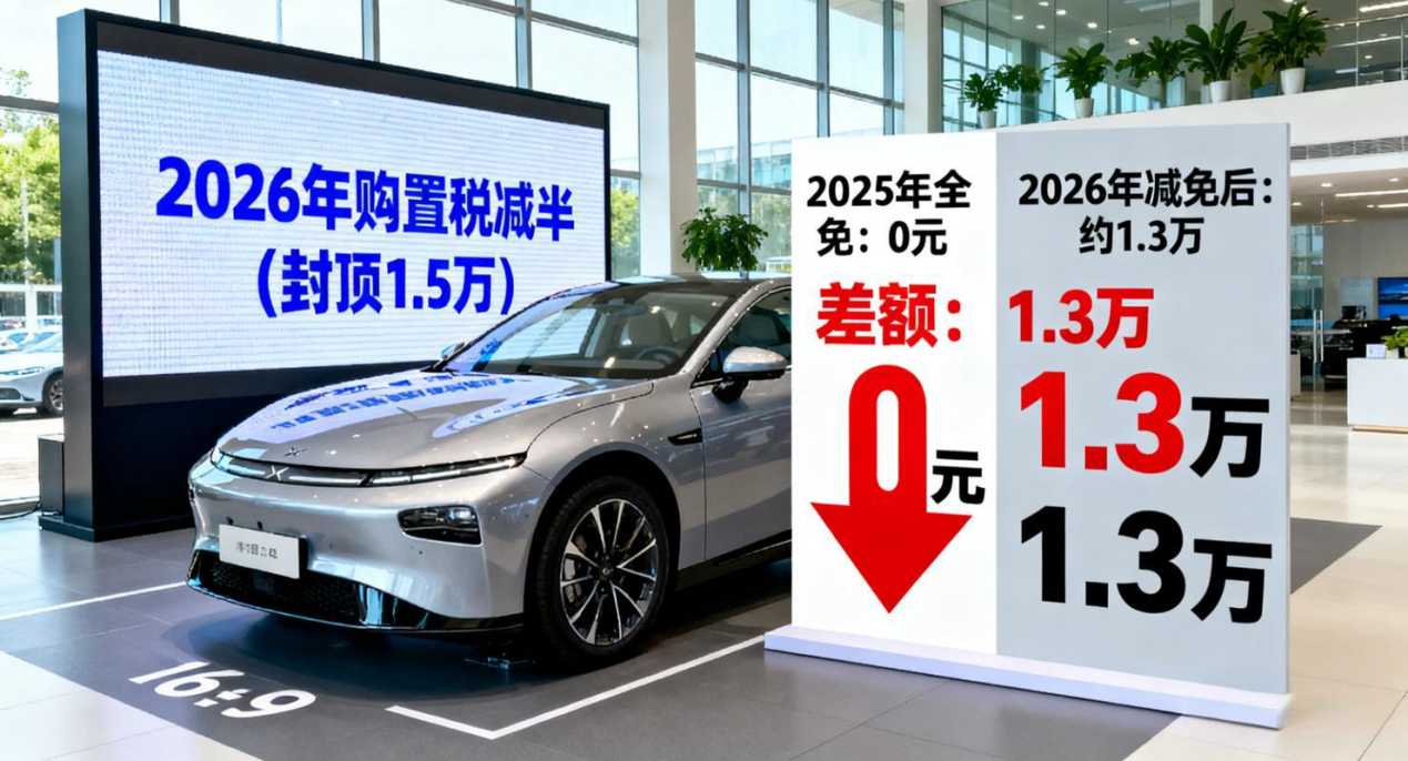 2026年起,新能源汽车购置税将从现行的“全额免征”调整为“减半征收”,单车最高减免额不超过1.5万元。以一辆开票价30万元的新能源车计算,今年购车可节省约2.65万元,明年则最多省1.5万元,购车成本将显著增加。