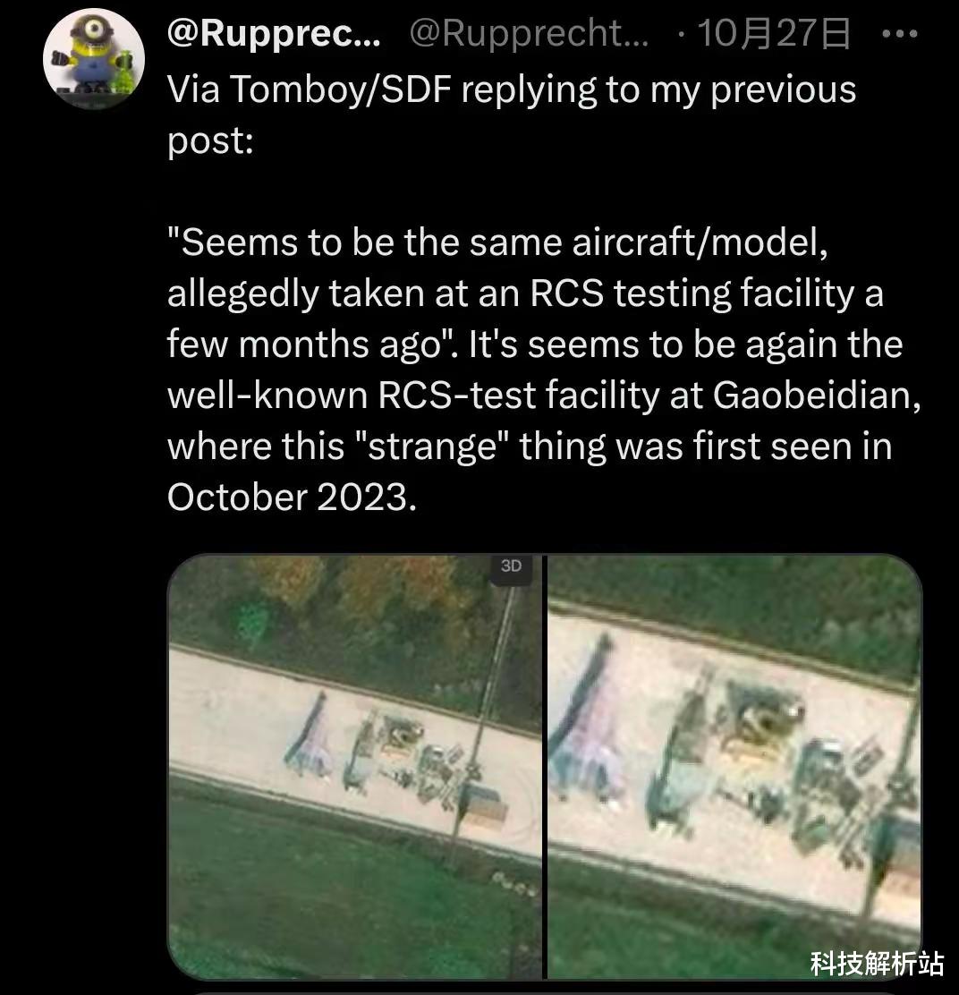 10月27日,德国军事专家鲁普雷希特发帖称,谷歌地图拍到了中国一款身份不明的飞机。