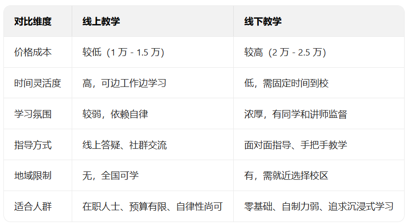 缺点:价格最高(2万-2.5万);学习时间固定,灵活性差;受地域限制,需前往校区上课。
