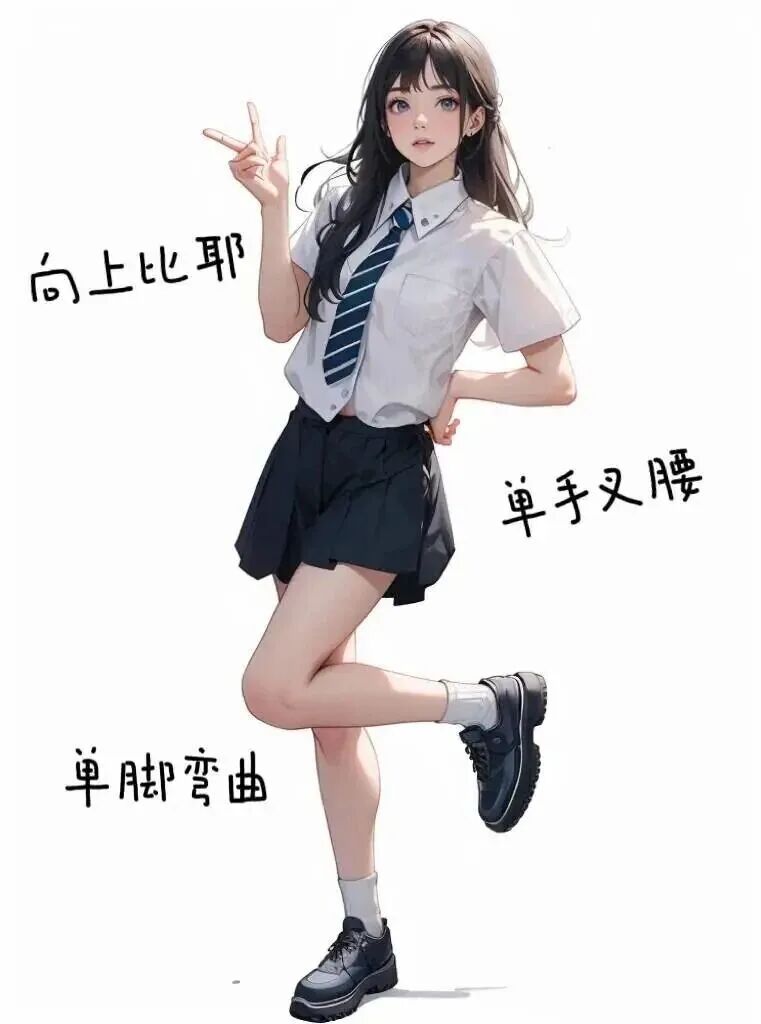 一只手向上比耶,另一只手叉腰,同时单脚弯曲抬起。比耶的手势活泼可爱,叉腰能展现自信,单脚弯曲让造型更具动感,这个姿势非常减龄,无论是和朋友合影还是单独拍照,都能让你瞬间成为焦点。