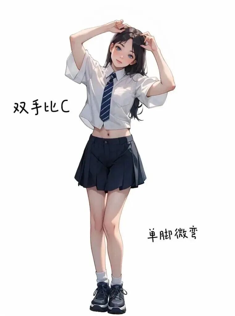 双手在头顶比出“C”形,仿佛要圈住头顶的阳光,单脚微微弯曲,重心落在另一只脚上。这个姿势能很好地展现出活泼俏皮的感觉,还能在视觉上拉长腿部线条,让整个人看起来更灵动轻盈,特别适合在户外阳光好的时候拍摄,分分钟get元气少女感。