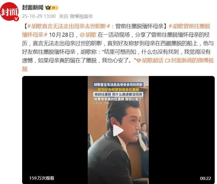 然而,再强大的人也无法承受“家人去世”的悲痛。2019年胡歌的妈妈去世了,让胡歌一度陷入存在主义危机。