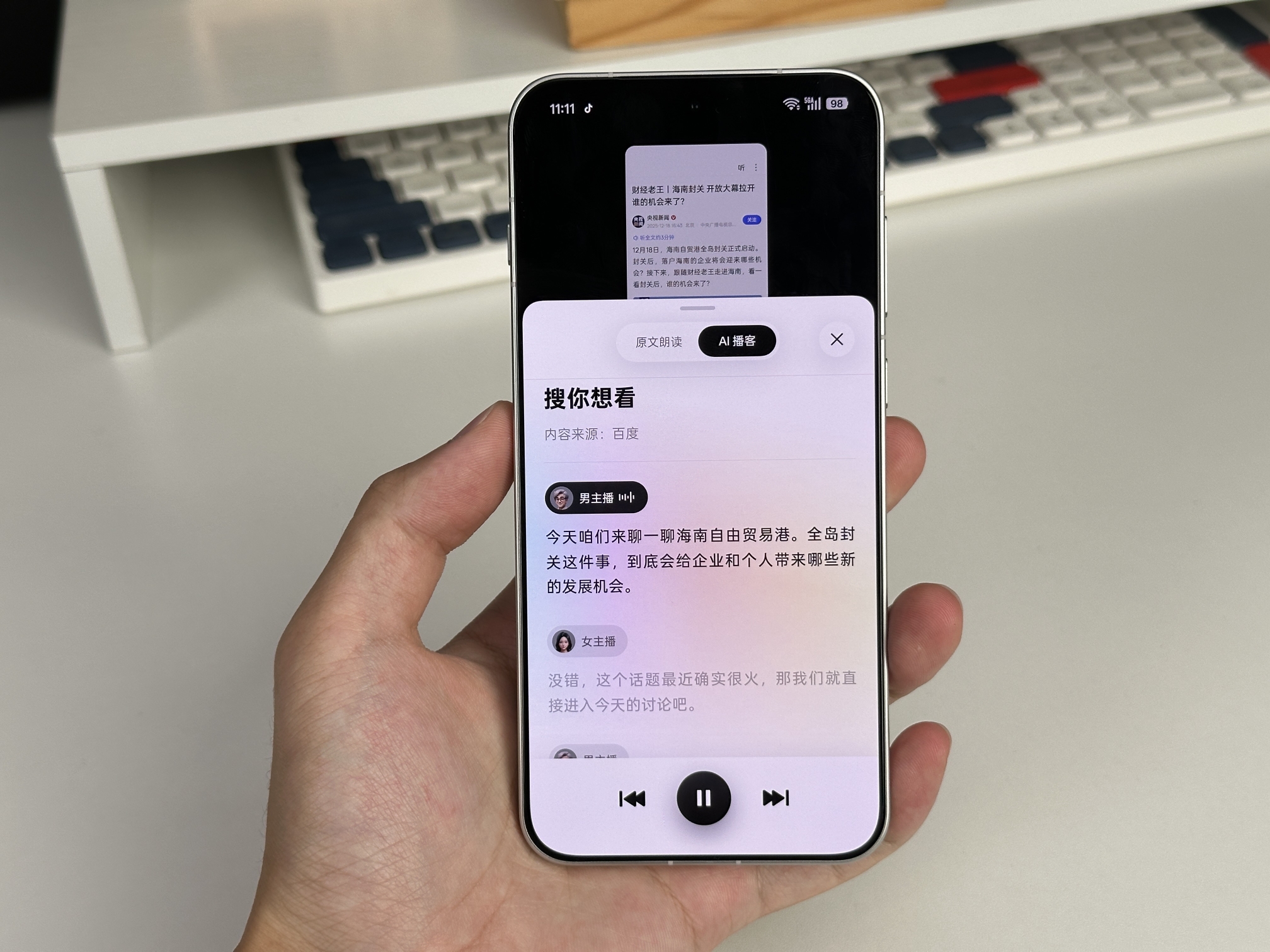 此次更新中,AI能力的落地应用是另一大亮点。比如新增的“AI播客”功能,可以在阅读长文章或新闻报道时,迅速将文本内容转换为清晰流畅的语音播客,甚至还配有背景音乐,让我们获取资讯更加的简单方便。