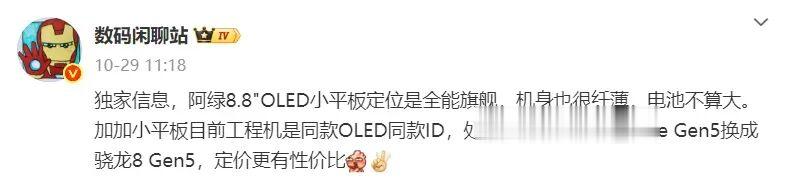 与此同时,博主@数码闲聊站 此前发文透露,“绿”厂正在打造 8.8 英寸 OLED 小屏平板,定位是“全能旗舰”,机身也很纤薄,但电池容量不算大,而“加加”厂的小屏版工程机目前配备同款的 OLED 屏幕和 ID 设计,处理器考虑从第五代骁龙 8 至尊版换成骁龙 8 Gen 5,定位“更有性价比”。