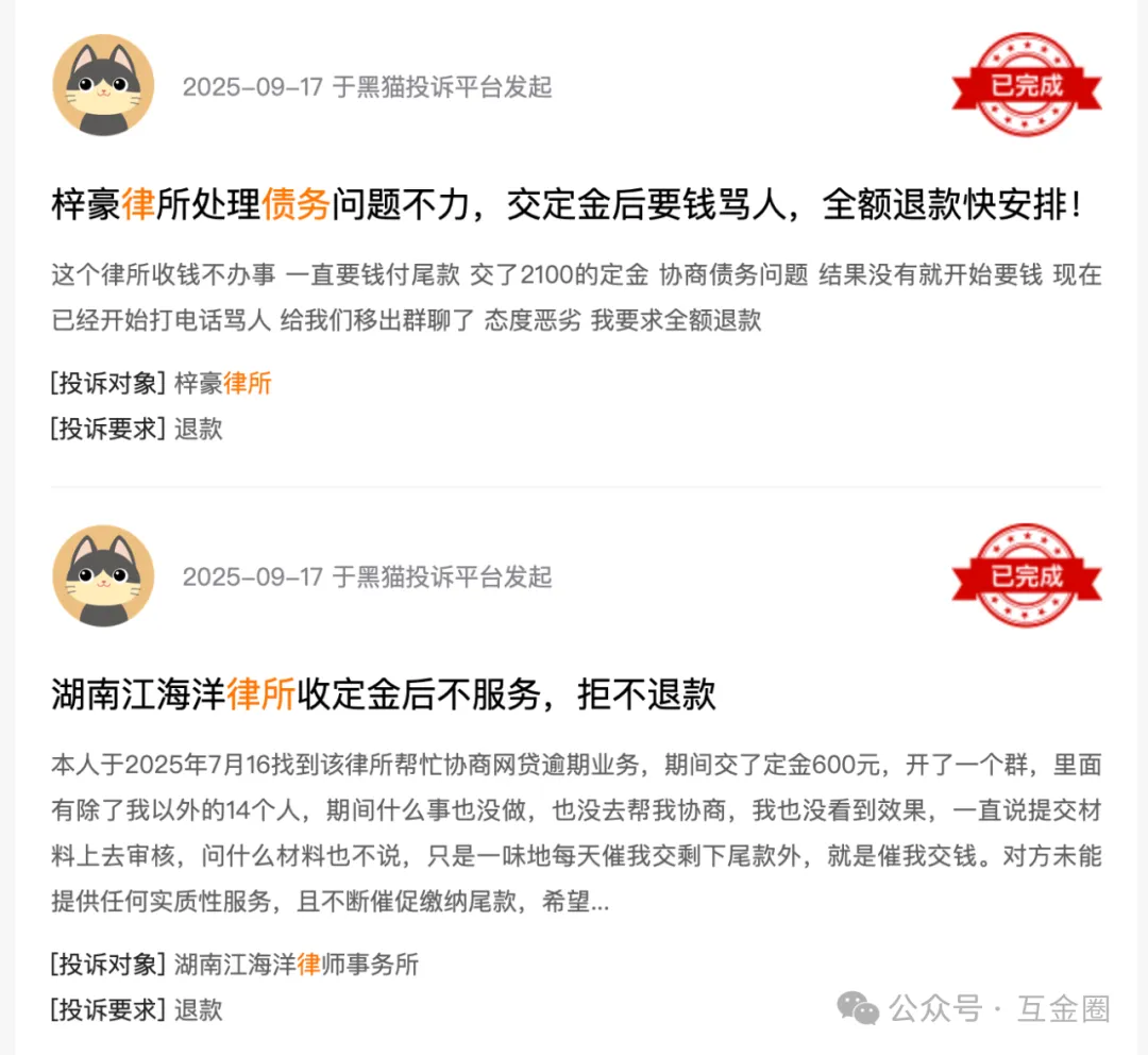 从黑猫投诉来看,不少用户都存在向律所交完定金,试图进行网贷债务协商,但却未得到实质性服务,并未真正解决其自身债务问题。