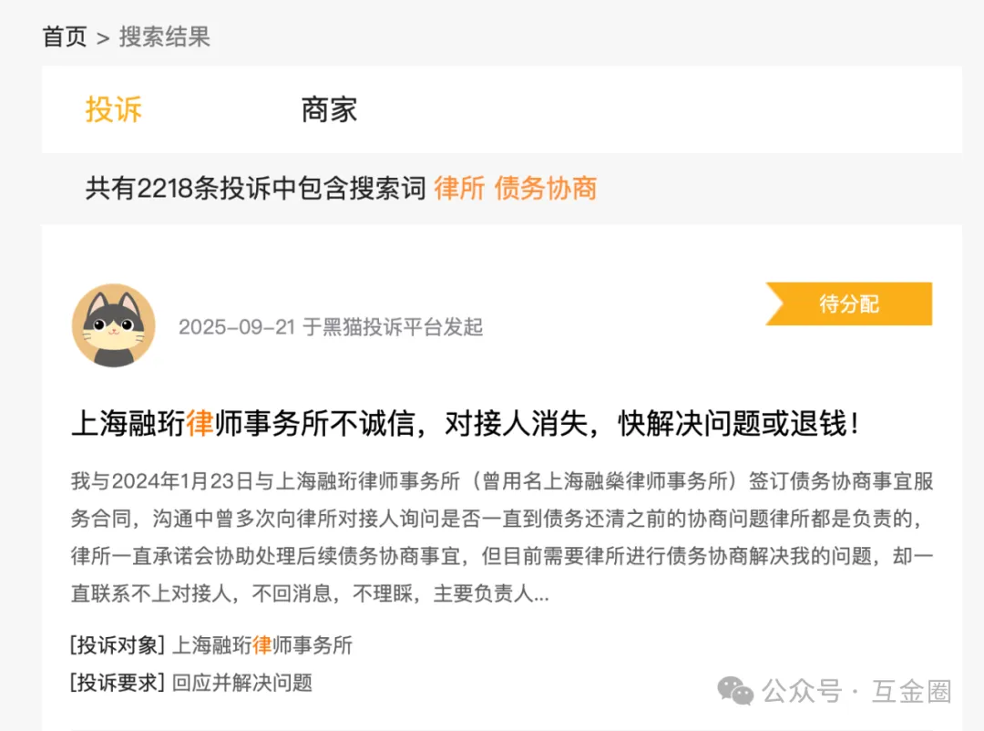 在新浪黑猫投诉平台上,搜索“律所”+“债务协商”词条,相关投诉有2218条。