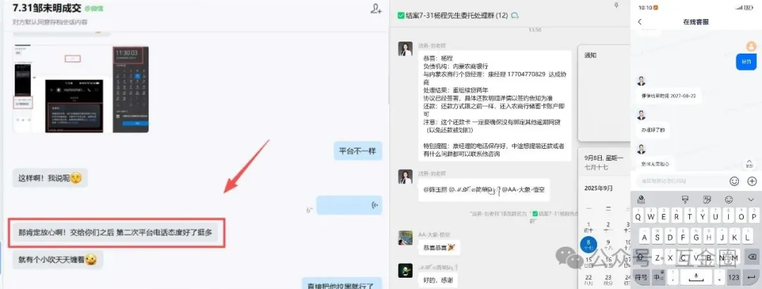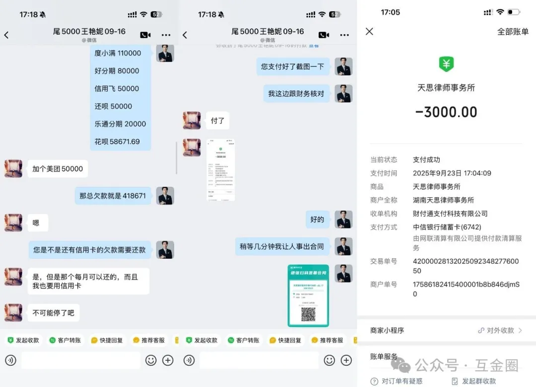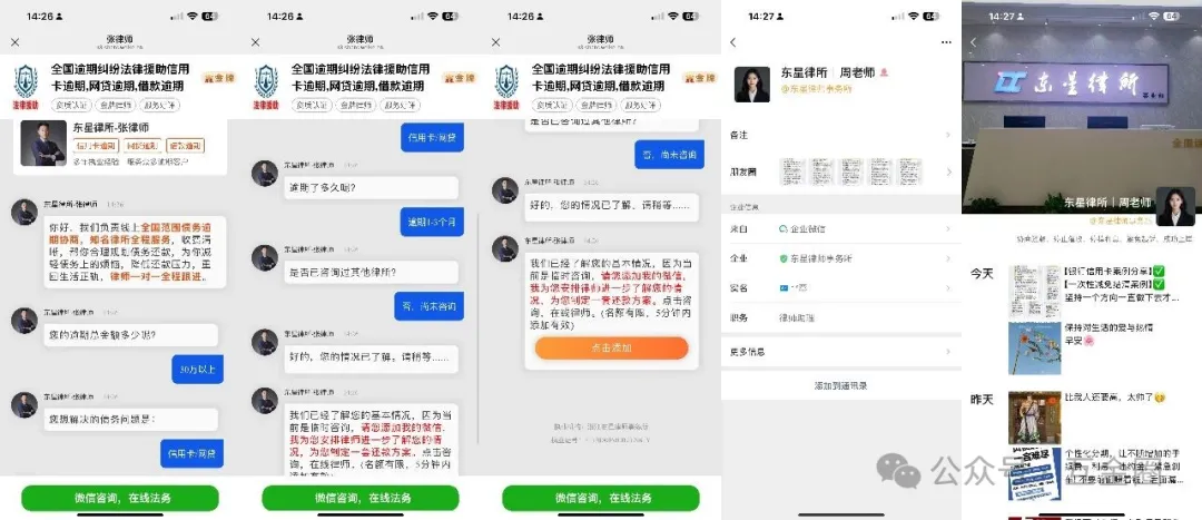 「互金圈」通过广告添加了湖南某律所工作人员,以“协商网贷只还本金”为由与之联系,对方随即拨来语音电话(遭拒后),声称“不同平台有不同协商方案”,并发来多张“停催成功截图”佐证实力。
