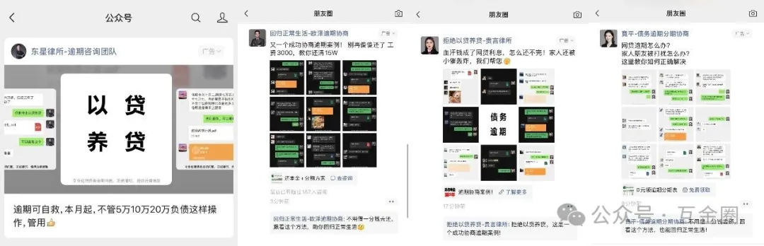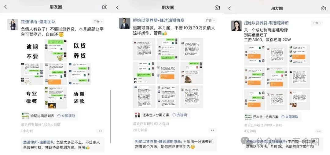「互金圈」近日频频在公众号、朋友圈、抖音等处刷到“律所-逾期咨询”“债务协商”等广告,广告多以“成功协商逾期”“逾期可自救”等等字眼呈现,精准击中借款人急于解困的心理。