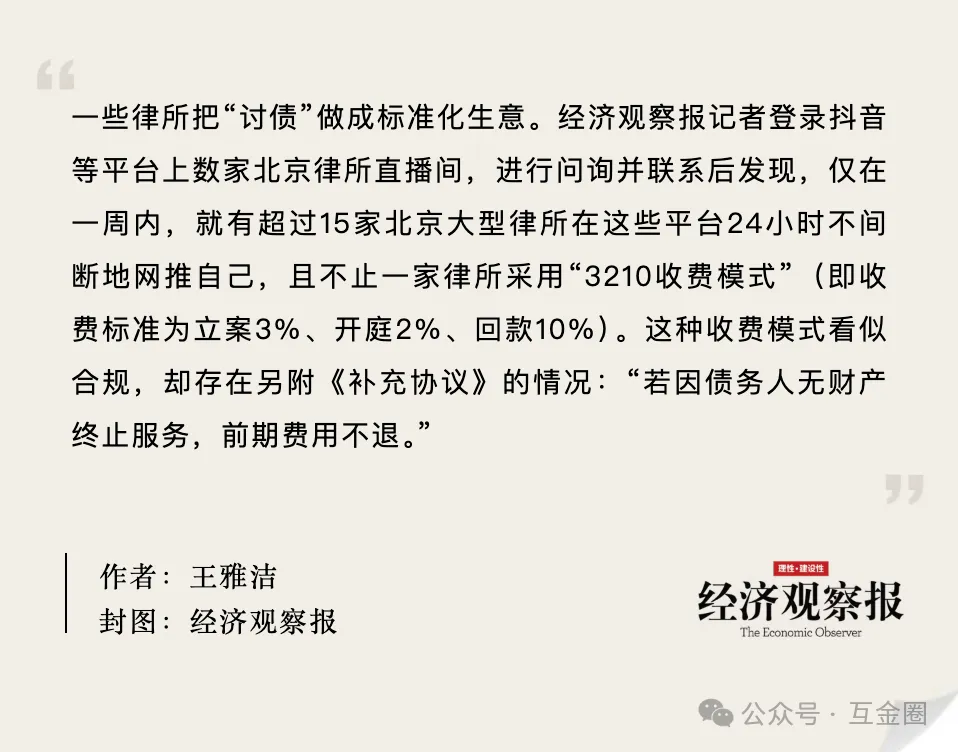据《经济观察报》今年7月报道,一些律所把“讨债”做成标准化生意。记者进入抖音等平台上的数家律所直播间,问询并联系后发现——仅在一周内,就有15家以上北京大型律所24小时不间断地网推自己,且不止一家律所采用“3210收费模式”(即收费标准为:立案3%、开庭2%、回款10%)。这种收费模式看似合规,却存在另附《补充协议》的情况:协议约定“若因债务人无财产终止服务,则前期费用不退。”