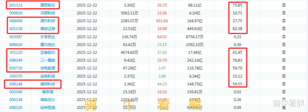 12月22日(周一)慕思股份解禁比例达到75.85%;源杰科技解禁比例达到27.75%;首创证券解禁比例达到82.38%;亚香股份解禁比例达到41.45%;三一重能解禁比例达到76.83%;华电能源解禁比例达到59.79%;南网科技解禁比例达到59.55%;蓝宇股份解禁比例达到41.17%;拉普拉斯解禁比例达到42.69%。