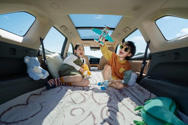 “豪华主卧” 是把后备箱里的充气床垫展开,充好气后能形成一个平整的睡眠空间,大概有 1.8 米长,成年人躺进去没问题。周末去露营,不用搭帐篷就能在车里休息,下雨的时候也不怕被淋到。“阳光露台” 是牧高笛联合定制的天幕,展开很快,能形成 270° 的全景空间。几个朋友一起露营,在天幕下野餐、聊天,视野非常好,比普通帐篷通透多了。
