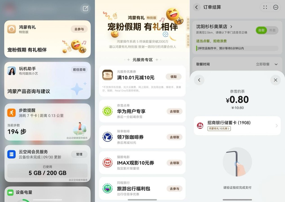 游览途中渴了,不妨点上一杯小甜水,既解渴又好喝。如果你是鸿蒙5手机用户,现在还有个额外福利:从9月30日到假期结束,进入华为负一屏的“鸿蒙有礼特别版”活动入口,每天可以领取一张满10.01元减10元的元服务优惠券。这些券能在奈雪点单、瑞幸咖啡等元服务下单时直接抵扣,只需几毛钱就能点一杯奶茶。对于本身零花钱就有限的同学们来说,这个优惠还是挺靠谱的。还有很多别的元服务也能适用优惠券,不妨打开鸿蒙5手机,进入活动界面试一试。