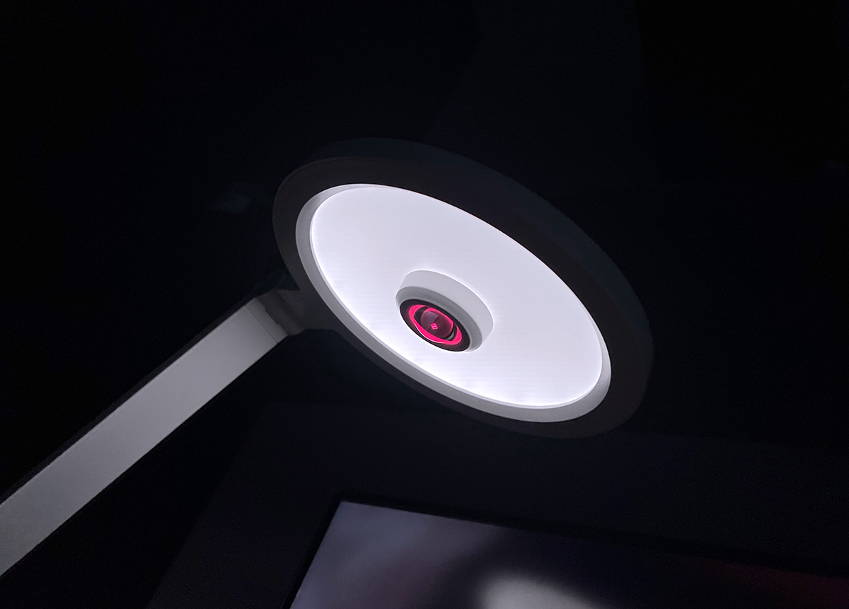 灯头采用的也是同样的圆盘外形,光源采用的是LED灯,同时可以看到在圆盘的正中间,还嵌入了一颗护眼红灯,这个是其他台灯所没有的,护眼红灯的调节按钮设在灯罩的背面,可以调节红光的均匀性。