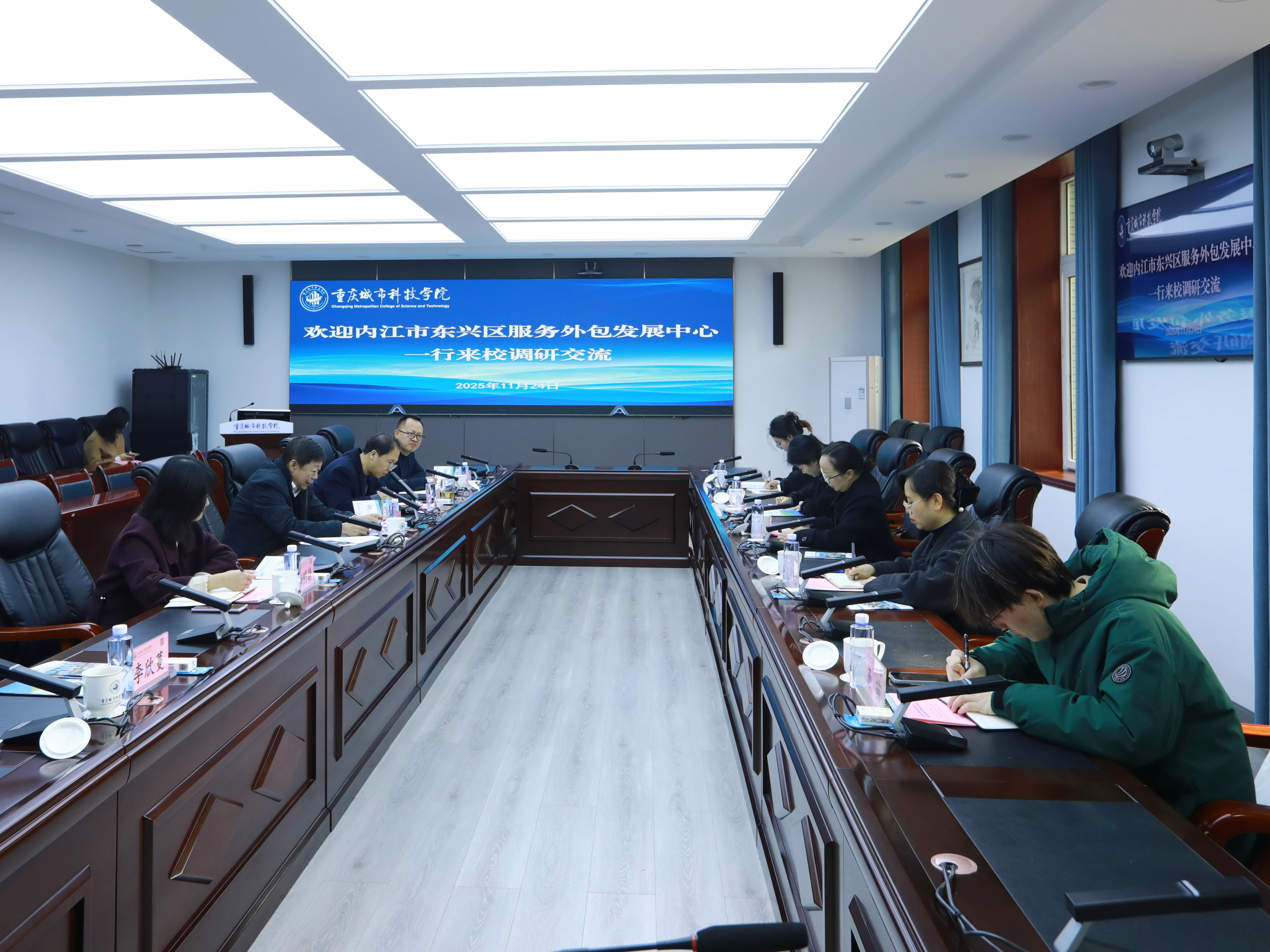 11月24日,内江市东兴区服务外包发展中心一行在区人大常委会副主任、人才保障工作组组长刘敏的带领下,莅临重庆城市科技学院开展校地合作调研。双方围绕人才供需对接、产教融合深化、区域协同发展等议题深入交流,共商合作路径。重庆城市科技学院副校长杜元虎,党委副书记、副校长贾瑞及相关部门负责人热情接待并参与座谈。