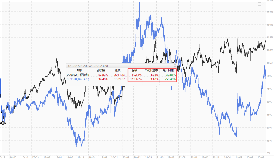 过去10年,成长指数的最大回撤接近60%,而红利指数只有30%。如果把回撤当作是一种波动,那么成长股的波动性就是红利股的两倍。