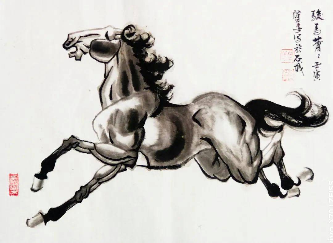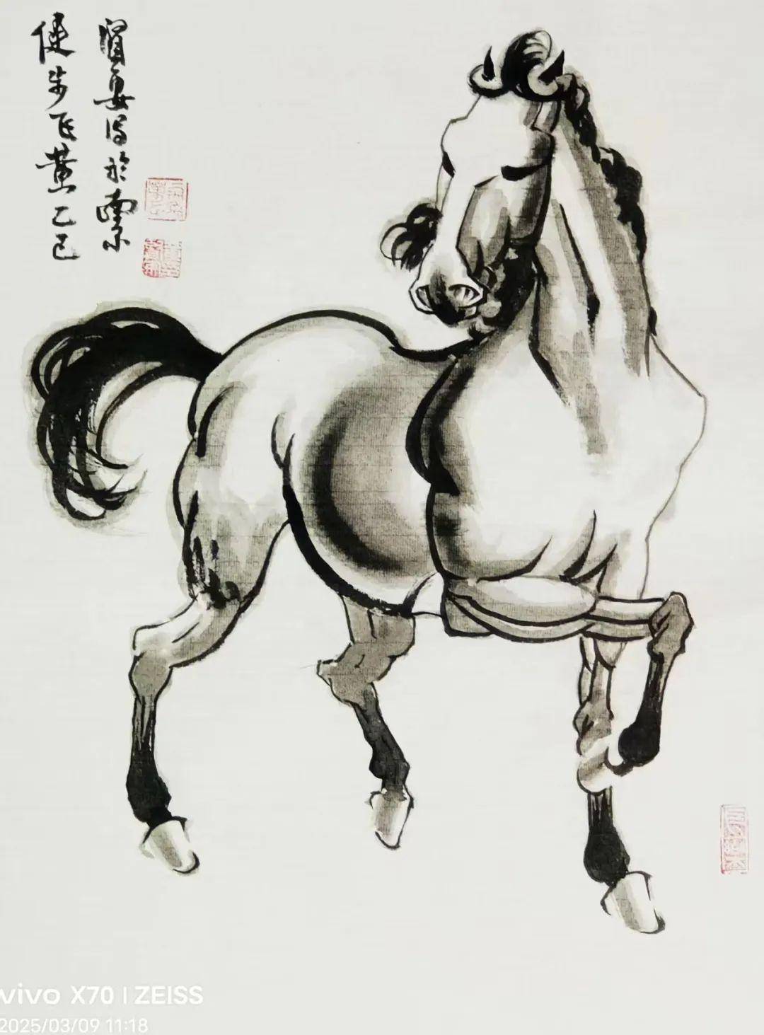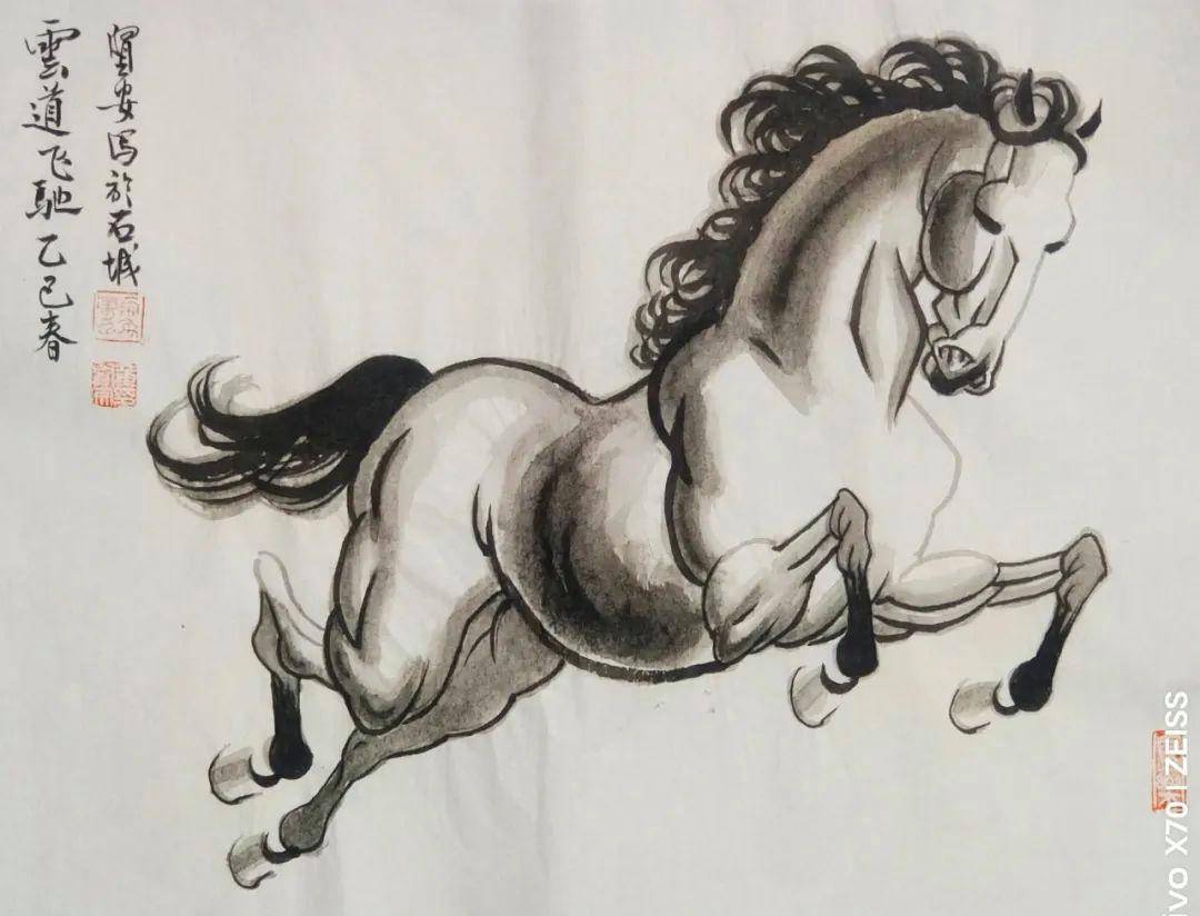 黄贤安先生爱马,爱的如痴如醉;他由爱马而画马,画到废寝忘食,达到痴迷的程度,可谓“马痴”。他对马的身体结构十分熟悉,再加上他常常外出到草原观察马的生活习性,对马的行走坐卧等姿态悉心观察,尽力图绘摹写,积累了十分丰富的写生经验。可以说,他对马的把握无论从外在形态还是从内在的性情非常熟悉,这些基本功力对他后来全心全意从事画马起了很大的作用。尽管如此,黄贤安先生并没有因功废事,他画马仍然十分专心,十分卖力。这样,经过十几年日复一日,年复一年,反反复复的探索、琢磨,其画马的技艺已达到十分精湛的地步。