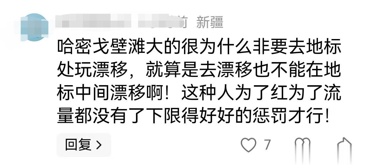 网友留言哈密戈壁滩那么大为什么非要去地标处玩漂移,就算去漂移也不能在大字中间漂移,这些人就是为了红为了流量没有下限,该好好惩罚才行!