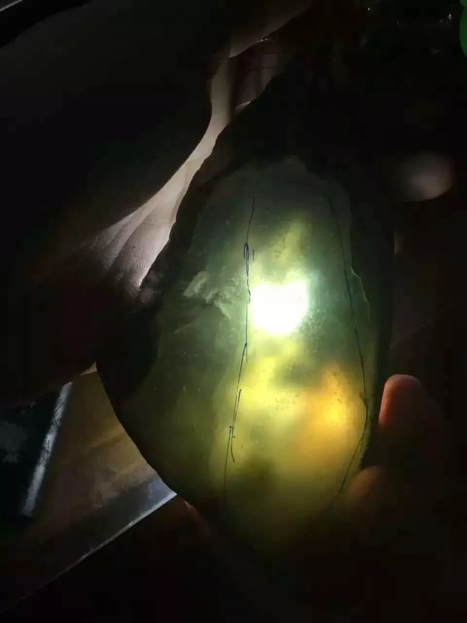 在灯光的照耀下,肉质细腻,种水已达到了冰种,底下的点缀黄味十足,仿佛如两个不同的世界交汇在了一起,细腻的质地上,雪花棉落在其中,清晰分明,虽未经雕琢,但已经有一种“点点皆清莹,粒粒如霜雪”的美感,实在是太美了!