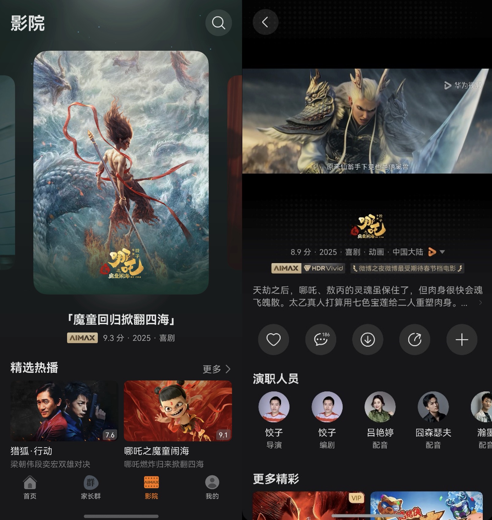 找到了心仪的片子,观影体验当然也不能含糊。这时候,就轮到华为视频里的AiMax影院闪亮登场了,支持最高4K高清画质,还拥有HDR Vivid菁彩影像和Audio Vivid菁彩声。点开AiMax影院的电影,你能立刻感受到与普通高清的差距。比如看国漫大片《哪吒2》时,画面明暗对比更强烈、色彩更靓丽,细节丰富清晰到仿佛触手可及,简直像把IMAX影厅搬进了客厅。再配上一桶爆米花和一杯可乐,这沉浸感,才是假期追剧的正确打开方式。