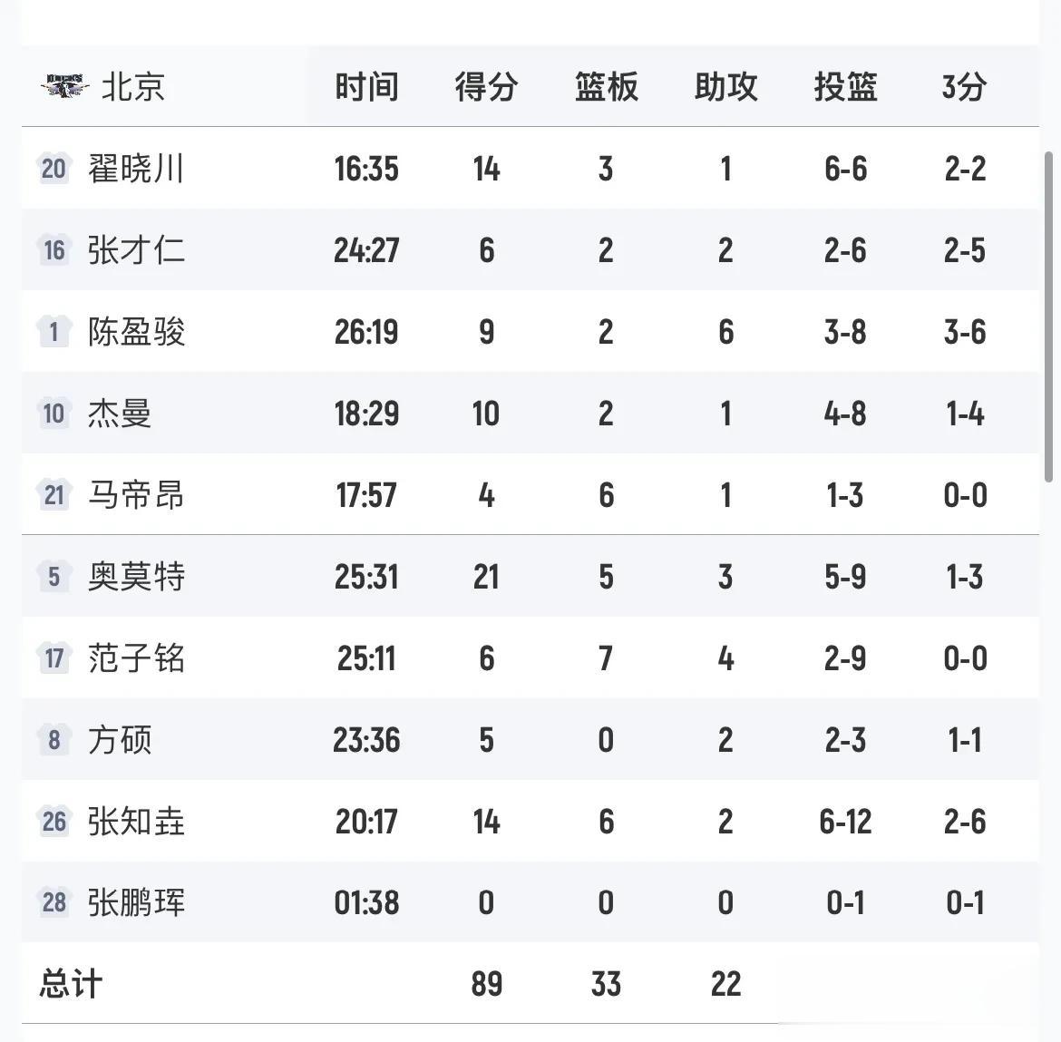 北京队这边,老将翟晓川创下6投6中,命中率达到100%的神举!但北京队上赛季总决赛期间发挥极其出色的后场双枪杰曼+陈盈骏手感不佳,这两人合计只得到19分。倒是替补球员张知垚成为北京队的奇兵,他全场得早14分6篮板。