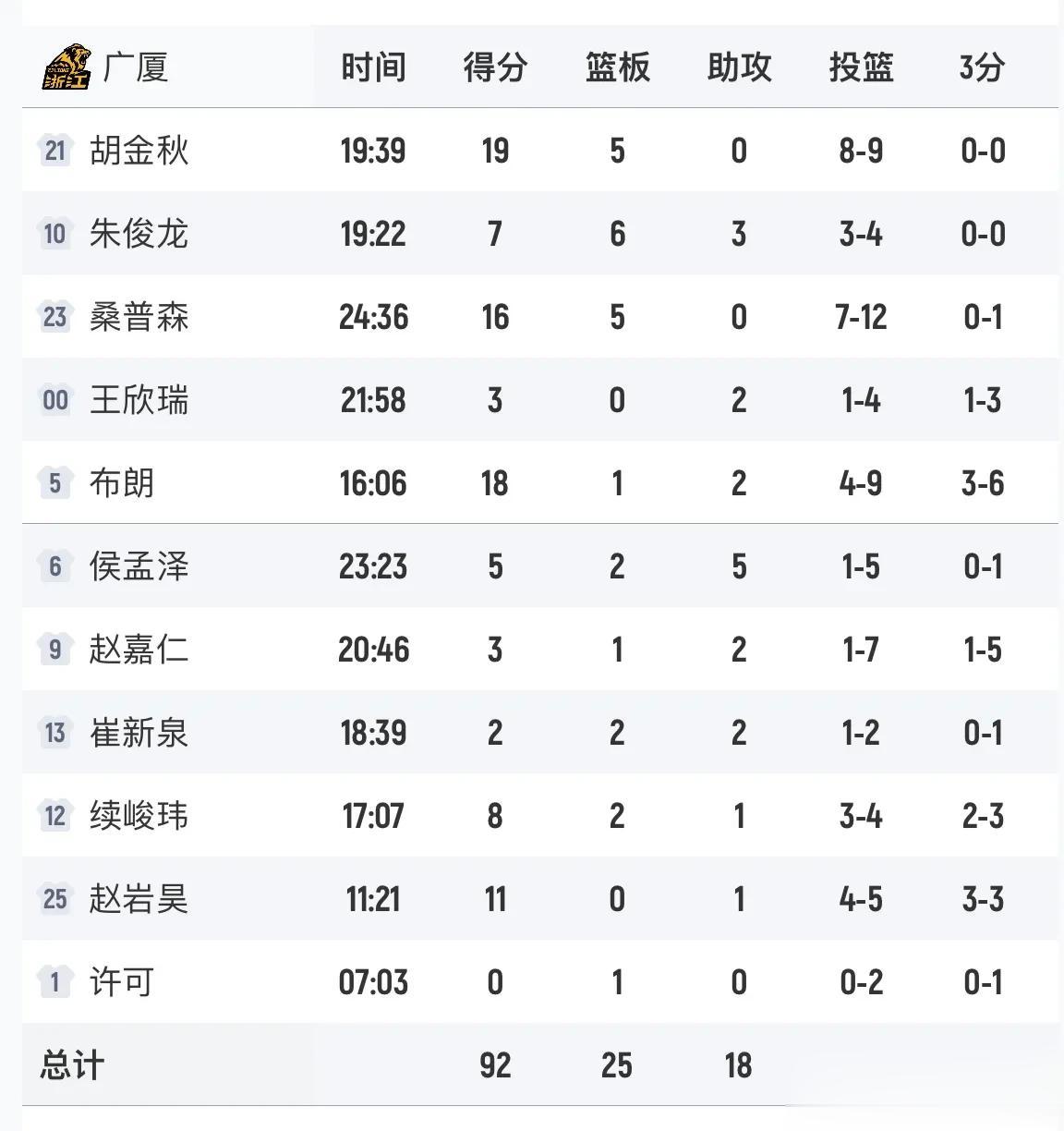 本场比赛,胡金秋依旧是广厦得分效率最高的球员,全场9投8中、罚球3中3,得到19分5篮板。射手赵岩昊三分球3投全中,中国男篮就是缺少这样稳定的三分射手。另外,广厦两名外援桑普森和布朗也合力砍下34分。