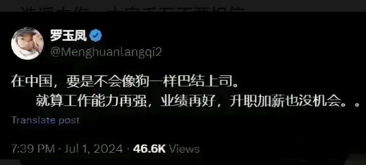 近期,美籍华人罗玉凤在社交媒体发表的一番言论引发轩然大波。她直言不讳道:在中国,要是不会像狗一样巴结上司,即便工作能力超强,业绩出类拔萃,升职加薪也没指望。这一言论不仅在国内外网友中引起热烈讨论,还让“职场生存法则”再次成为焦点话题。