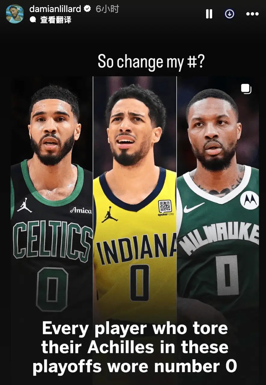 本赛季季后赛已经有三位超级巨星遭遇到跟腱伤病,利拉德血栓休战后强行复出导致跟腱撕裂,塔图姆疲劳作战导致跟腱断裂,巧合的是这三位球员都是身披0号球衣,利拉德在社交媒体发文:要换球衣号码么?