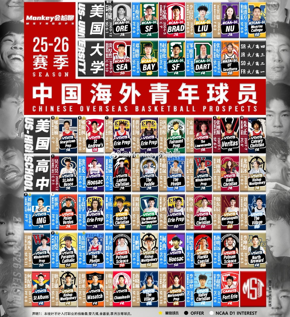 上方截图,是目前在美国NCAA和高中联赛效力的所有球员,NCAA男女篮一共有11人,杨瀚森没有在这份榜单上,他的消息大家都很清楚,所以不过多赘述。比较受大家关注的,有这么几名球员,俄勒冈大学的林葳,旧金山大学的王俊杰和赵伟伦,西雅图大学的淡厚然。以及高中联赛的张博源和朱正,这些人都被誉为是中国男篮的未来之星,尤其是王俊杰,在男篮亚洲杯上已经打出了非常精彩的表现。