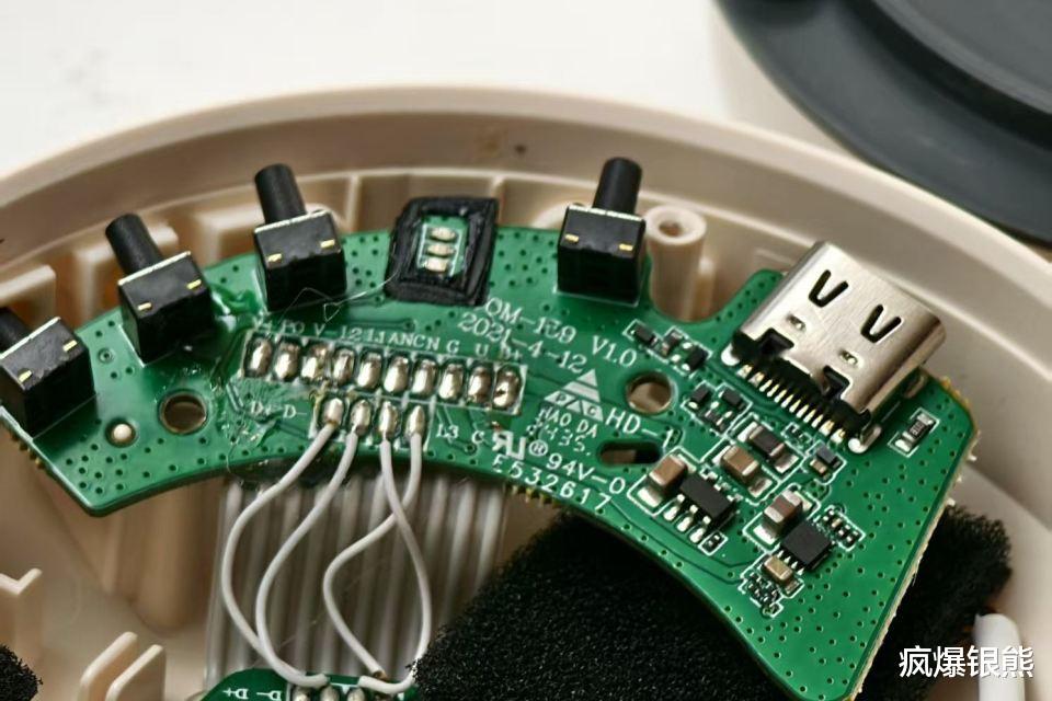 撕掉黑色泡棉主板正面样式如上图,除了连接右耳、扬声器和电池的线缆外,主板上还有一个前馈降噪麦克风。型号是镭雕的MD25 G135,用于拾取外界环境噪音。
