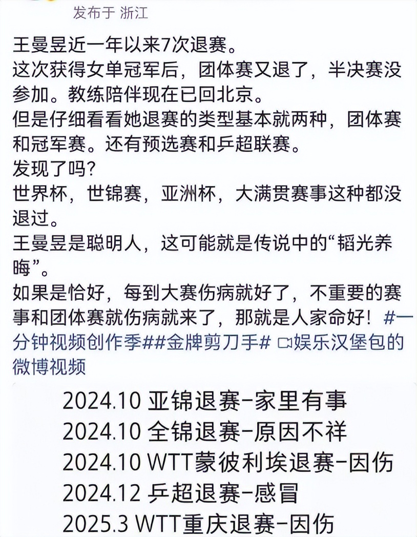 这些言论完全无视了王曼昱在比赛中需要医疗暂停、赛后行走踉跄的明显不适表现,也无视了官方清晰的医疗报告和运动员长期积累的伤病历史。