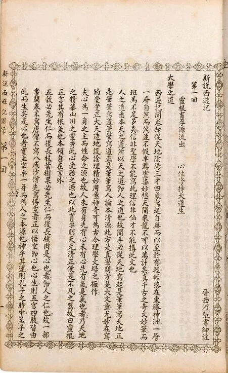 《西游记》是一部描写神魔斗争的通俗小说,《大学》是一篇儒家的经典著作,二者根本就是两回事,可张书绅是怎样把二者生拉硬拽到一起的呢?他在《新说西游记总批》中这样说: