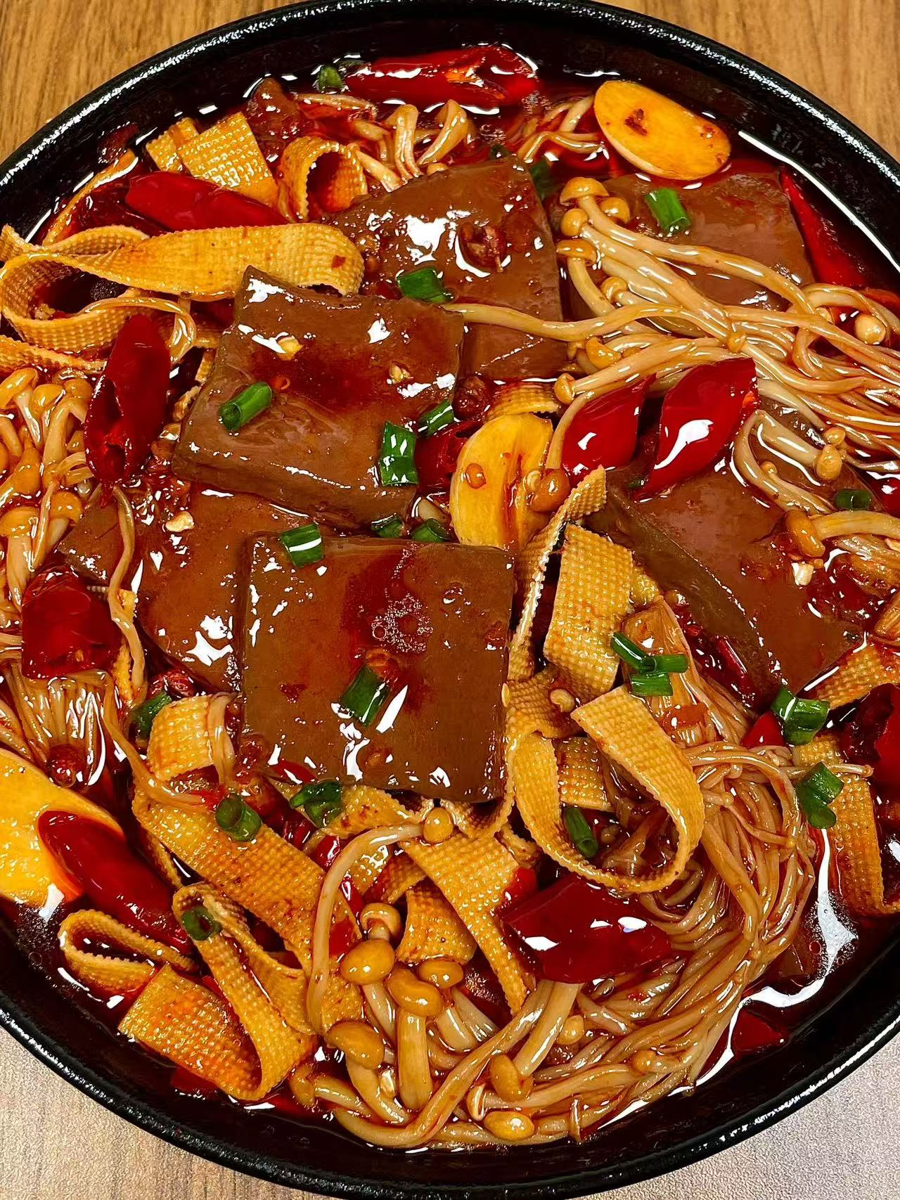 端上桌的那一刻,红油亮晶晶地裹着每一种食材,鸭血颤巍巍的,夹一筷子放进嘴里,滑溜溜的瞬间化开,麻辣汤汁在舌尖散开;豆皮吸饱了汤汁,咬下去汁水四溢,豆香混合着麻辣味超绝;金针菇软嫩爽口,每一根都裹满酱汁,越吃越上瘾。一家人围着桌子,就着这道毛血旺,米饭一碗接一碗,聊聊天、拌拌菜,幸福感爆棚!