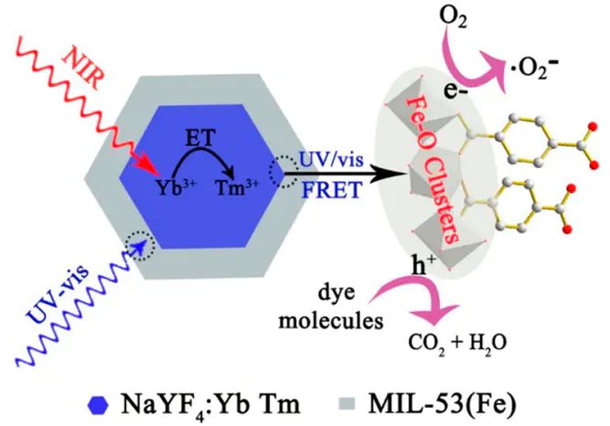 图1:UCNP@NH2-MIL-53(Fe) 催化降解染料的光催化路径。DOI:10.1021/acsami.6b15792