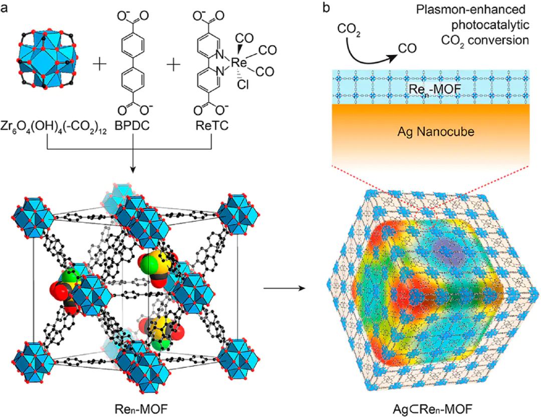 图3:用于光催化CO2还原的Ren-MOF包覆的Ag纳米立方体的合成 DOI:10.1021/jacs.6b11027