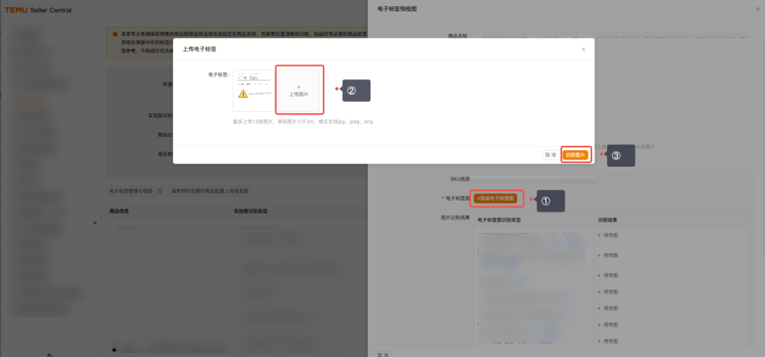 (七)进入“去上传”界面后,点击【添加电子标签图】--【上传图片】--【识别图片】。注:此处上传的图片为您制作的电子版商品标签。