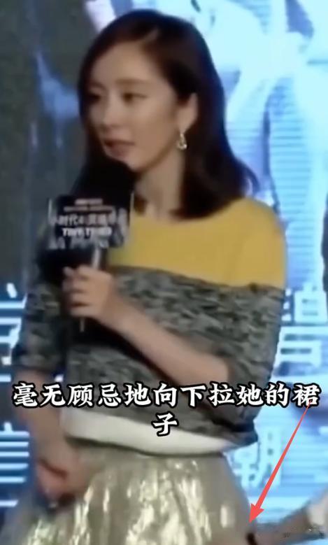 就是在当时她还没有爆火的时候在参加一个发布会的时候,在舞台上面站着发言旁边的一位导演却在用力的拽她的裙子往下拽,不知道是不是因为裙子踢得太高的原因她在用力的拽着自己的裙子,可是奈何台下那么多人也不能做出不好的举动,更何况当时的他也是一位小小的演员,