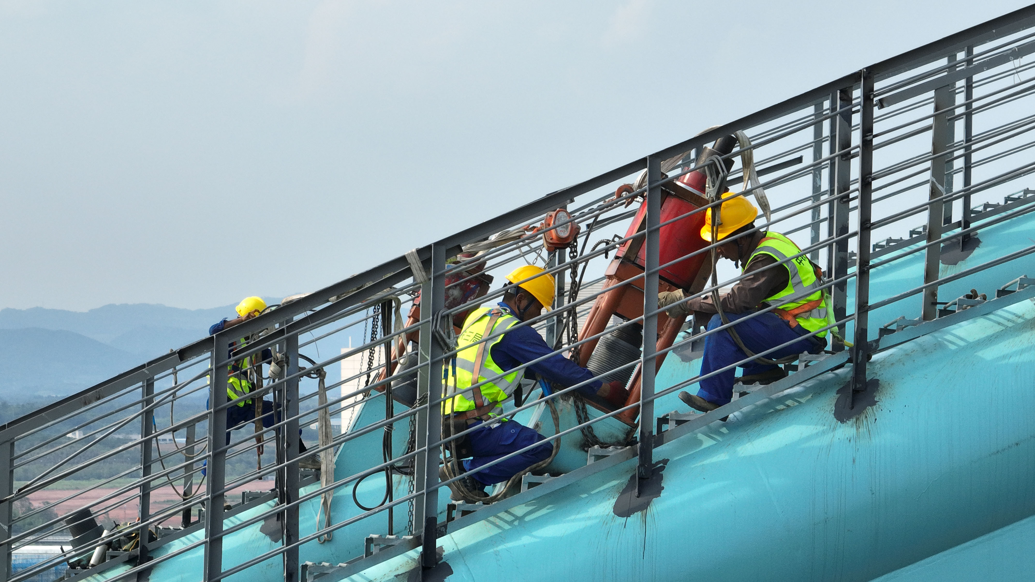 据中铁三局成渝中线高铁四川段项目部负责人介绍,面对拼装精度要求高、高空作业风险大等挑战,施工团队通过应用“钢管拱安装用临时支架”在预先浇筑完工的系梁上搭建临时支架,为高空作业人员的安全与下方道路车辆通行顺畅提供双重保障;利用“失圆与错台调整装置”,失圆与错台调整装置对拱肋节段进行尺寸检测与机械矫正,确保施工精度与质量;通过“拼装用定位装置”对出现错台的拱肋节段快速调整,将安装精度控制在毫米级。这些智能工装都是我们自主知识产权,不仅有效解决了因结构拼装偏差导致二次吊装等质量问题,还大幅度提升了安全性。