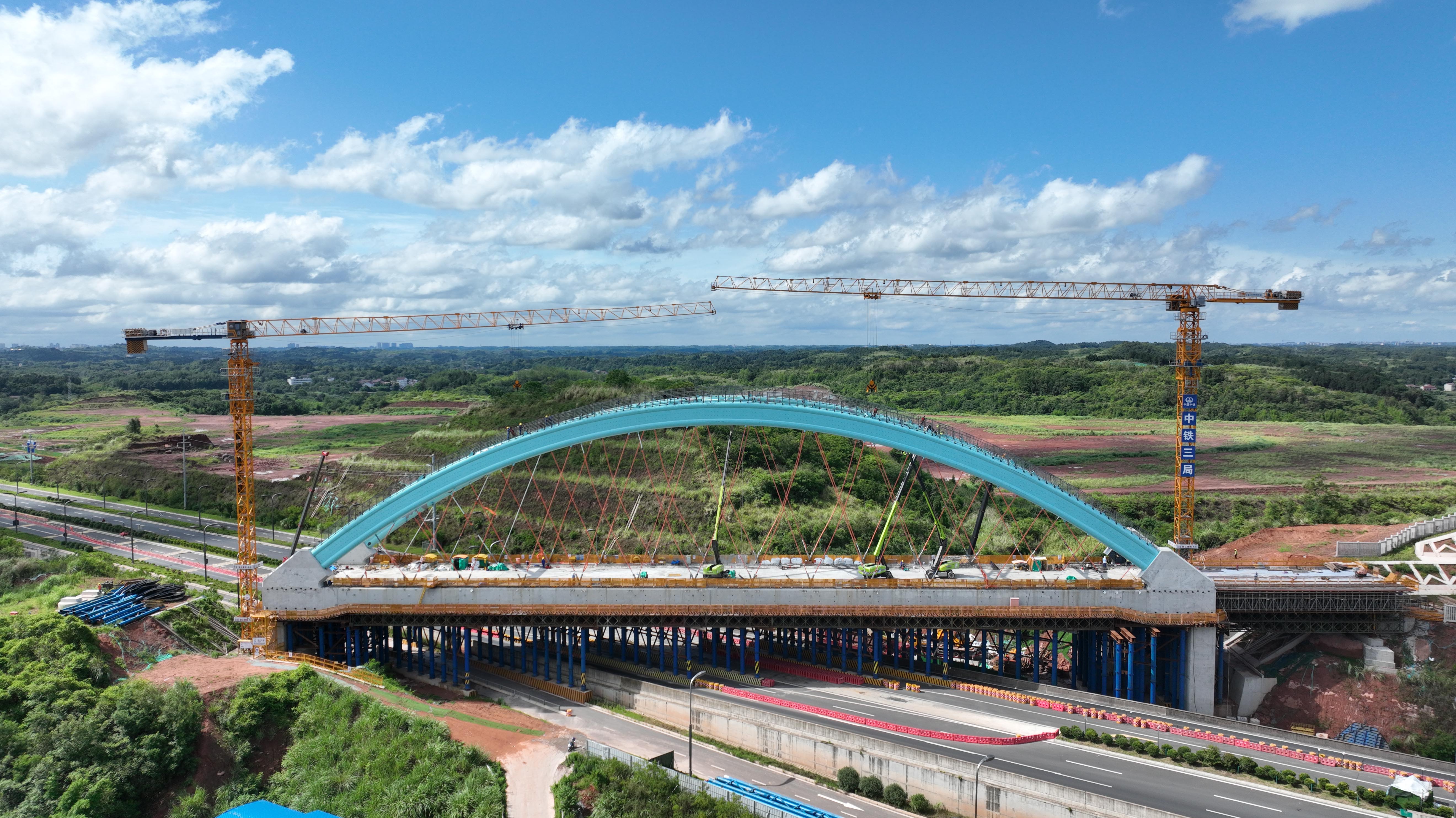 跨成龙简快速路特大桥位于成都市东部新区石盘街道,是简州站出站至成都方向的第一座特大桥,全长2423米。系杆拱桥是指由拱肋、吊杆和桥面板等协同工作的组合结构桥梁,以系杆(梁)承受拱脚水平推力为特征,兼有拱桥的较大跨越能力和梁桥对地基适应能力强的两大特点。