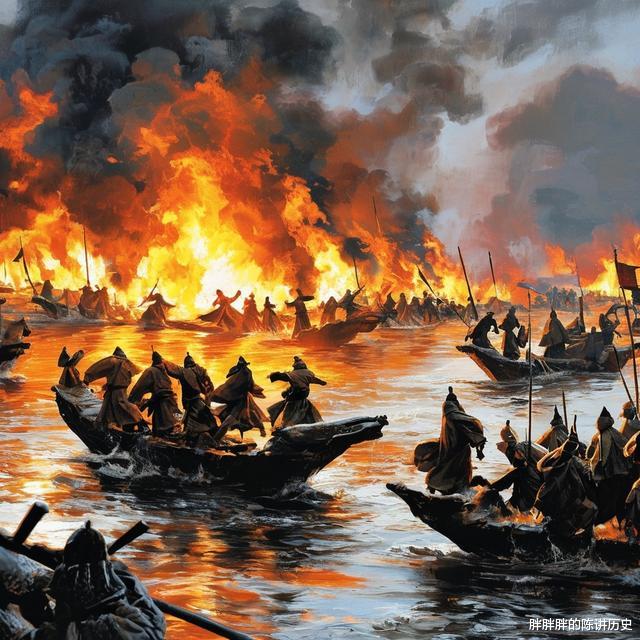 曹操在亲卫死命簇拥下,仓皇登上小船,在一片火海与喊杀声中狼狈北窜。回头望去,身后那片吞噬了他二十万精锐和无数战船的滔天火海,映红了他灰败的脸颊和颤抖的瞳孔。那曾经代表他无上权势的楼船巨舰,在烈焰中断裂、倾覆、沉没,连同他席卷江南、一统天下的霸图,一同化为乌有。此刻,只有华容道泥泞小径上那惊魂落魄的逃亡,和北岸凛冽的寒风,才能让他感受到一丝冰冷的真实。