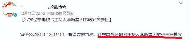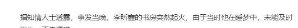 12月11日,据媒体消息透露,李昕鑫因家中书房着火不幸去世,年仅37岁。