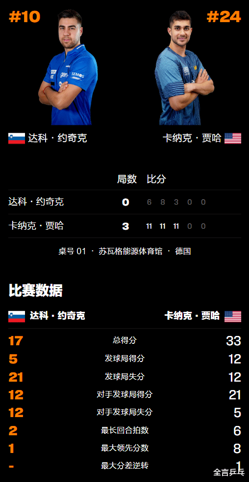 不过就在今年10月30日的时候,卡纳克便在WTT法国蒙彼利埃冠军赛上爆冷3-2击败雨果,但很快又2-3不敌韩国老将李尚洙而被淘汰,如今再战WTT德国法兰克福冠军赛,世界排名第23的他又在首轮与排名第9的达科相遇,双方在首局并未打得非常激烈,达科最终以6-11败北。