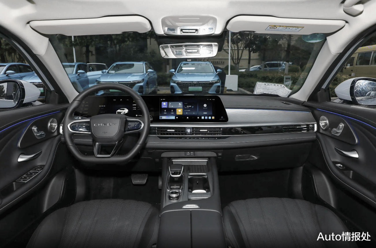 2025款奇瑞风云A8内饰延续了家族式设计风格,方向盘采用平底式设计,中控台还提供连体式液晶屏幕,全液晶仪表的尺寸为10.25英寸和12.3英寸,中控屏幕的尺寸为10.25英寸和12.3英寸,车机芯片为高通骁龙8155。