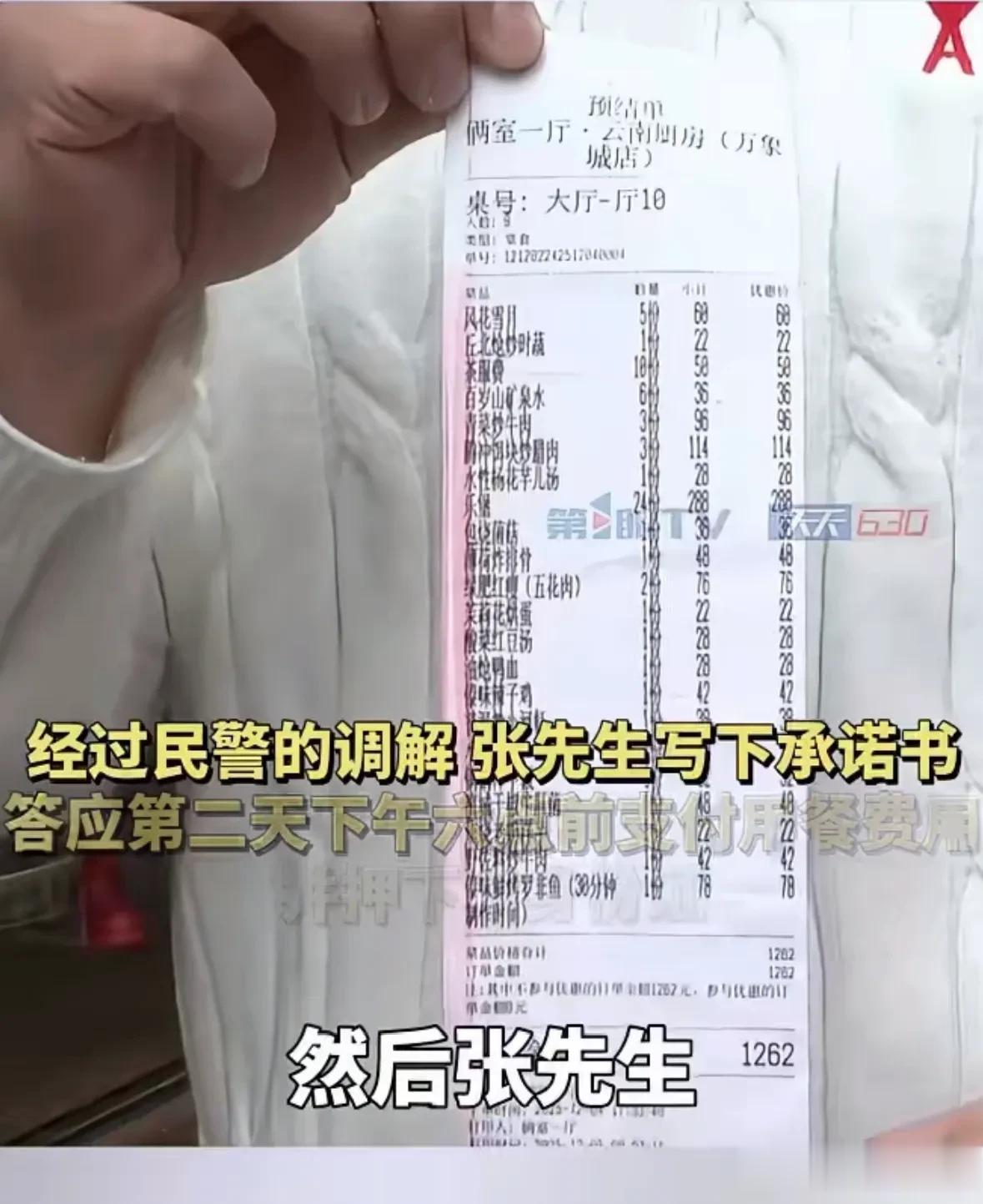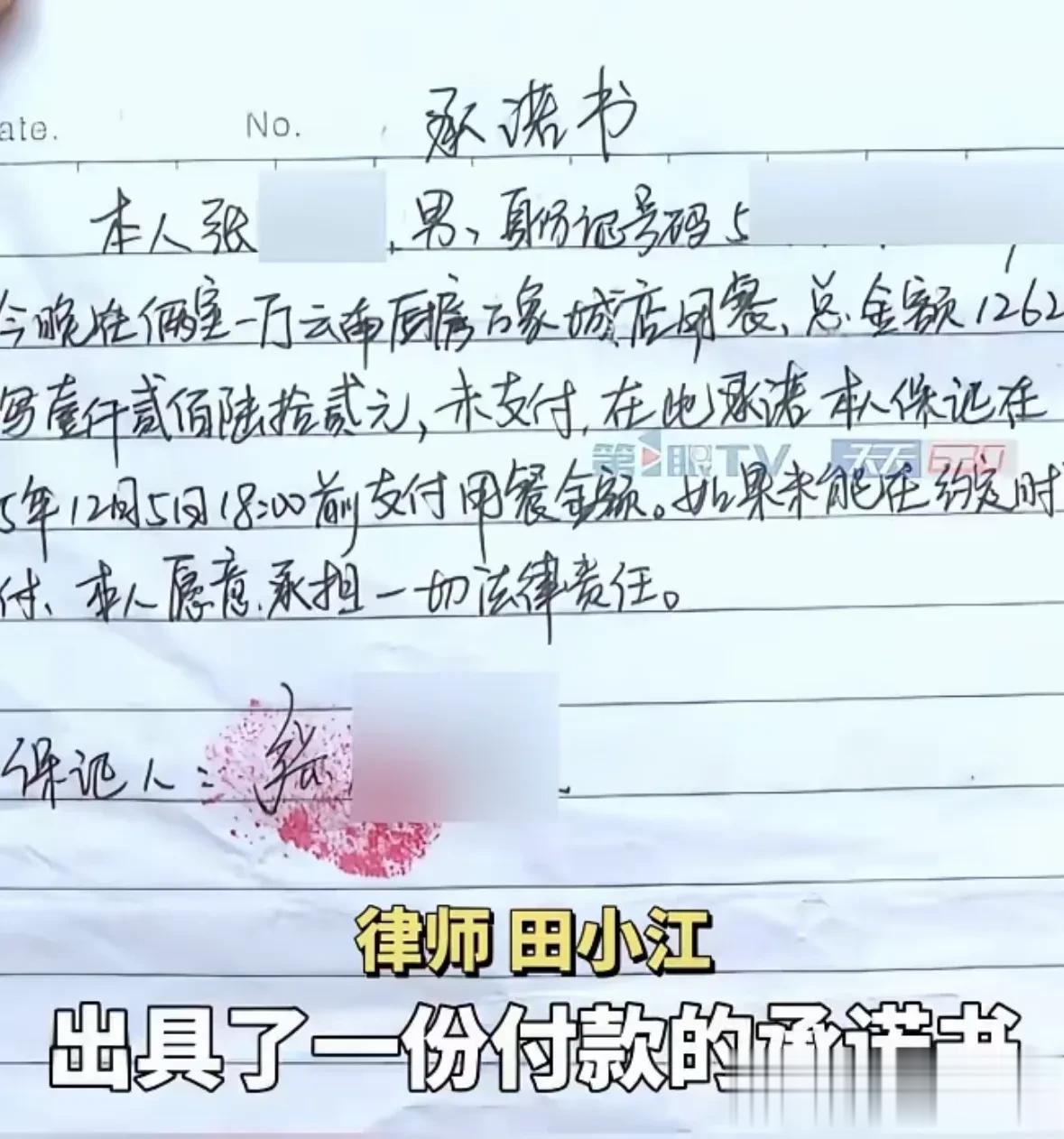 可人都跑光了,餐馆总不能白干。老板报警,警察来了也只能协调——最后张先生写下承诺书,押了身份证,答应第二天晚上6点前结清。