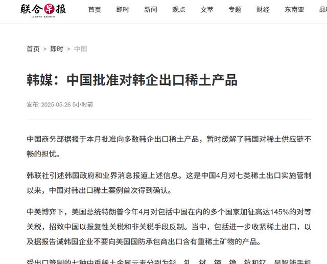 这也是自从中国4月4日对七种中重稀土实施出口管制以来,首次确认对韩出口。