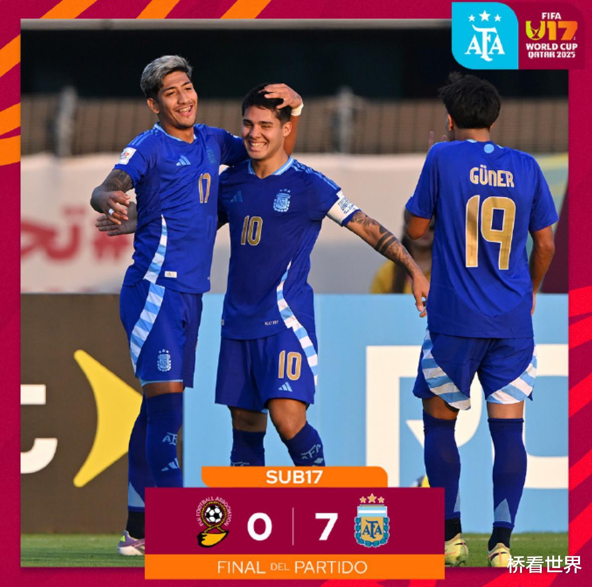 世少赛(U17 世界杯) D 组收官战,阿根廷 U17 国家队以 7-0 的悬殊比分大胜斐济队,凭借三战全胜、进 11 球失 2 球的完美战绩,以小组头名强势晋级淘汰赛。队长乌列尔・奥赫达完成帽子戏法,后卫马特奥・马丁内斯贡献双响,圣地亚哥・西尔韦拉、西蒙・埃斯科瓦尔破门,迭戈・普拉森特执教的 “潘帕斯雏鹰” 展现出压倒性的竞技优势。