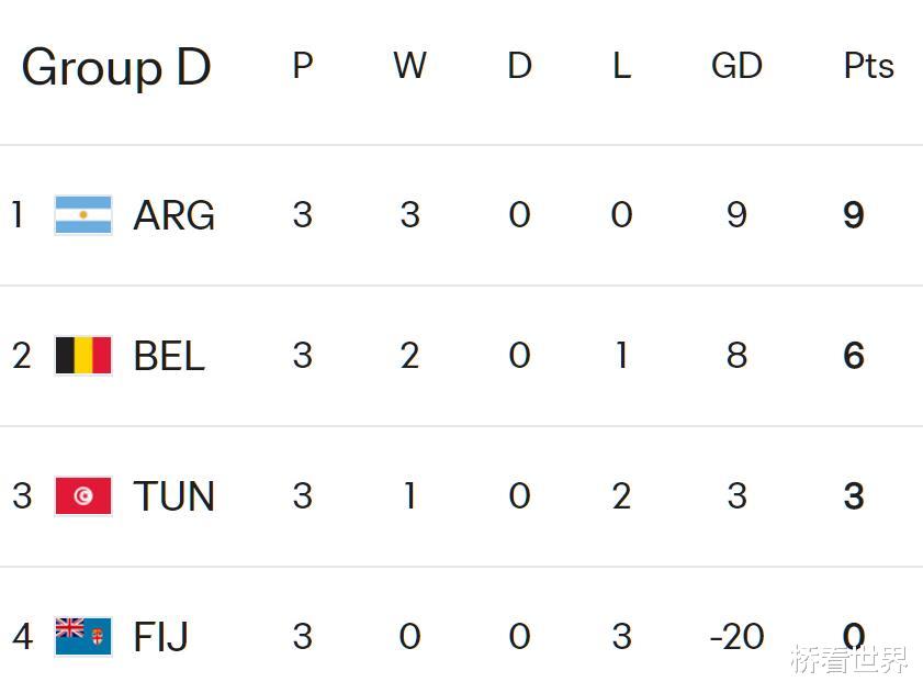 在同时进行的 D 组另一场比赛中,比利时队2-0击败突尼斯队,以小组第二的身份晋级淘汰赛。最终,阿根廷队以 3 战全胜积 9 分的战绩锁定小组头名。待所有晋级淘汰赛的球队全部产生后,将按排名排序,由排名最高的小组第一(第 1 位)对阵排名最低的小组第三(第 32 位),依此类推完成所有对阵组合。