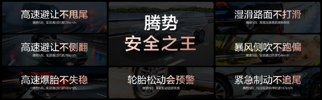 主动安全方面,得益于易三方,腾势N8L能够以128km/h高速避让不甩尾、210km/h高速避让(鱼钩测试)不侧翻、180km/h高速爆胎不失稳、154km/h暴风侧吹不跑偏、147km/h AEB自动紧急制动、不怕雨雪路面打滑、车轮松动监测系统,以科技安全守护家人出行安心。腾势汽车不愧被称为新能源汽车的“安全之王”。