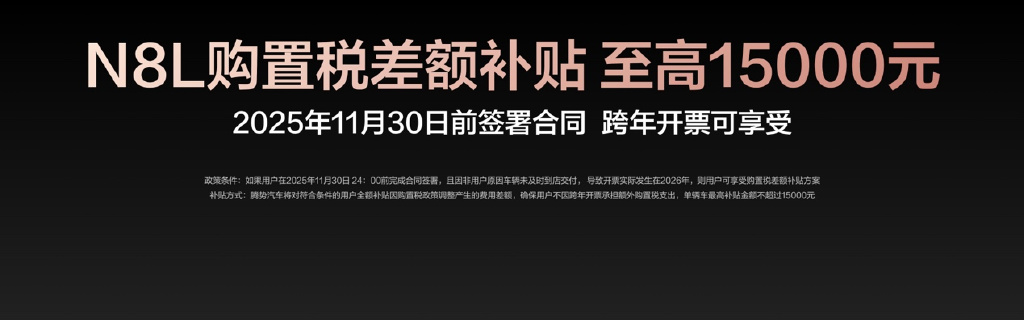 为回馈广大用户的支持与信赖,腾势N8L特别推出限时购车权益,权益价值至高10.67万元!包括价值1.7万元的三年免息,最高1万元的置换补贴。此外,不必担心因为交车晚,享受不到购置税补贴:在2025年11月30日24点前完成合同签署的用户,如果因非用户原因车辆未及时交付,导致开票实际发生在2026年,可享受购置税差额补贴,最高1.5万元!