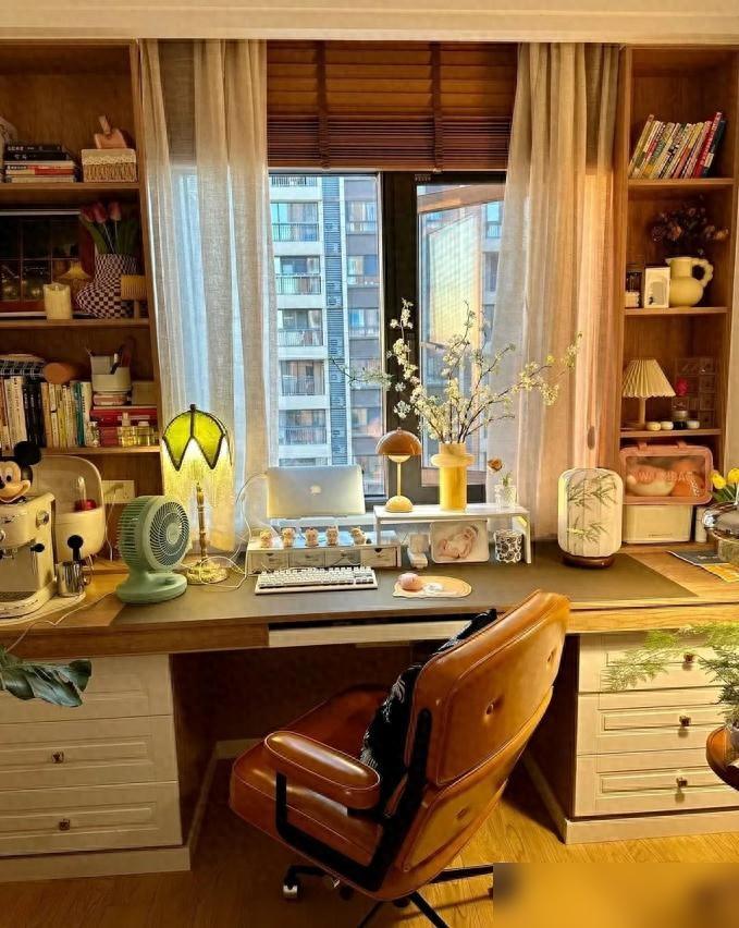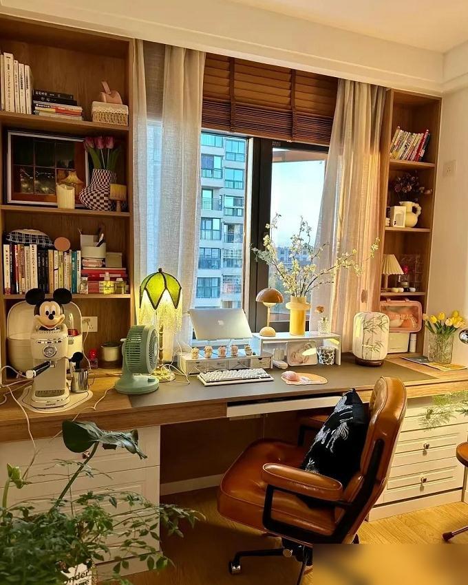 窗户边那张长桌,想法很妙。办公累了,一抬眼就是窗外,比什么护眼模式都强。桌子底下塞两组抽屉柜,杂物收得干干净净。桌面摆得满,却不显乱。花枝、台灯、咖啡机,都是过日子的小确幸。尤其那束白花,配个素净瓶子,立马就活了。书房里有点生机,心情都不一样。